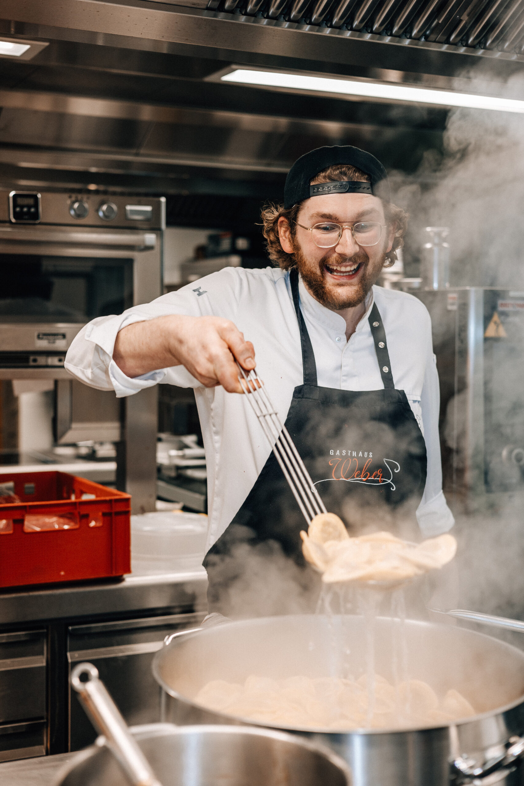 Die Franziska im Service und der Lukas, als kreativer Kopf in der Küche. Denn soviel dürfen wir schon verraten: Er wird der nächste Wirt vom Gasthaus Weber. Dafür bringt er alles mit, was ein gutes Wirtshaus ausmacht: Eine solide Ausbildung als Koch, Berufserfahrung in der ausländischen Hotellerie, im Catering bei Delikatessen Dallmayr München sowie in einem Sternerestaurant – und die Leidenschaft für eine gute Gastronomie.